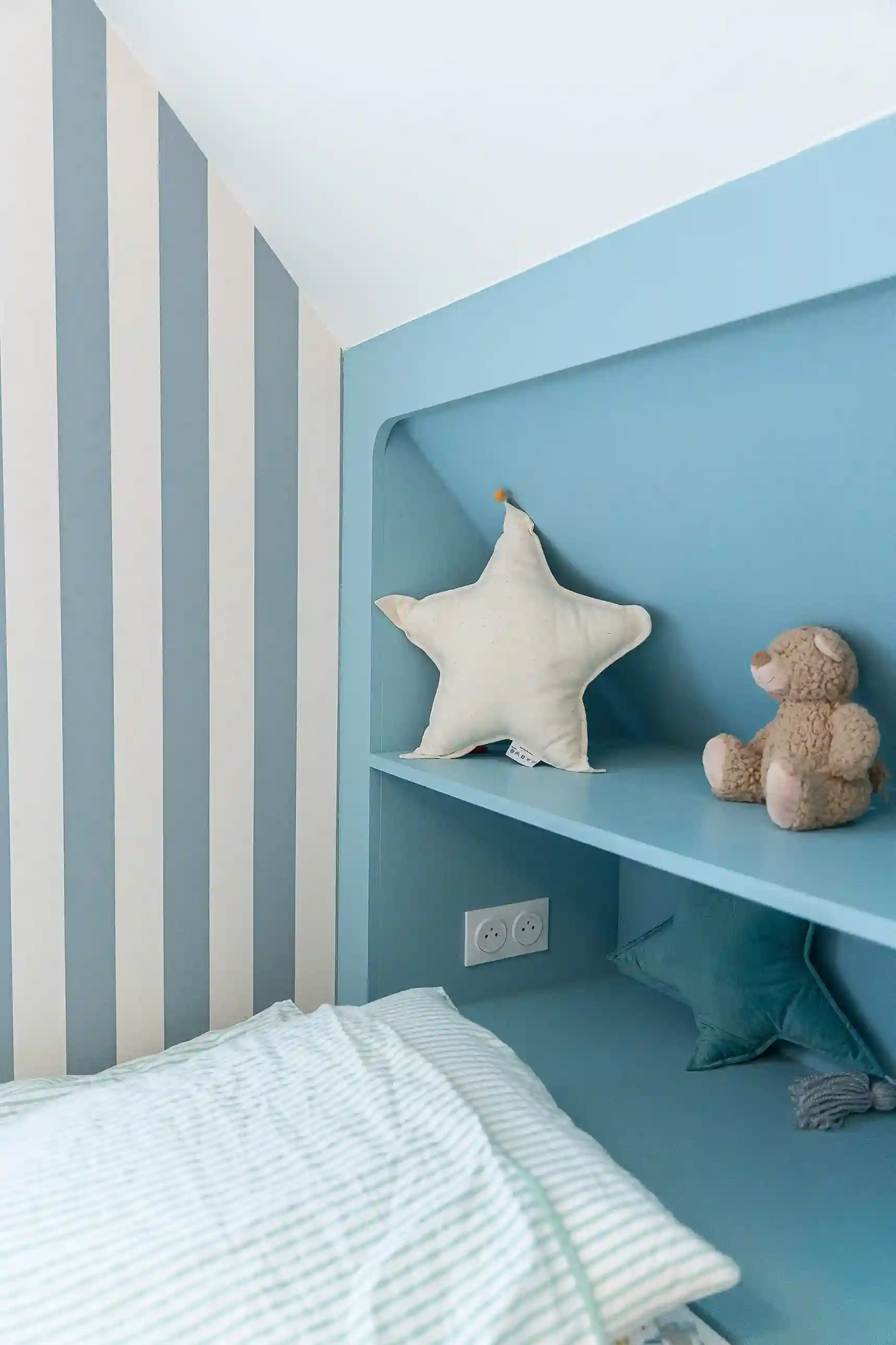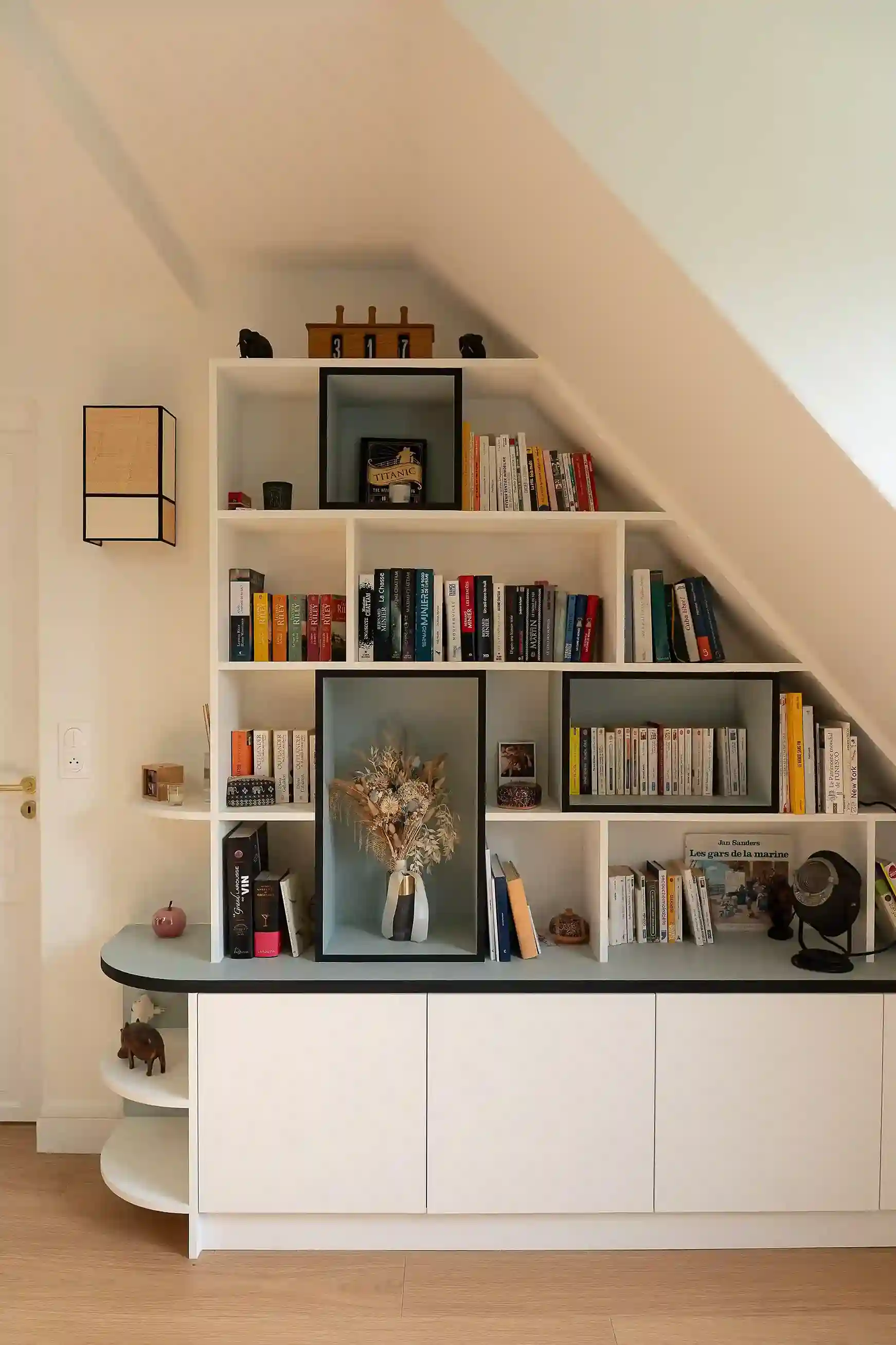 • Présence du bleu sur le mur du bureau, repris dans certaines niches de la bibliothèque, assurant une transition douce entre les usages.