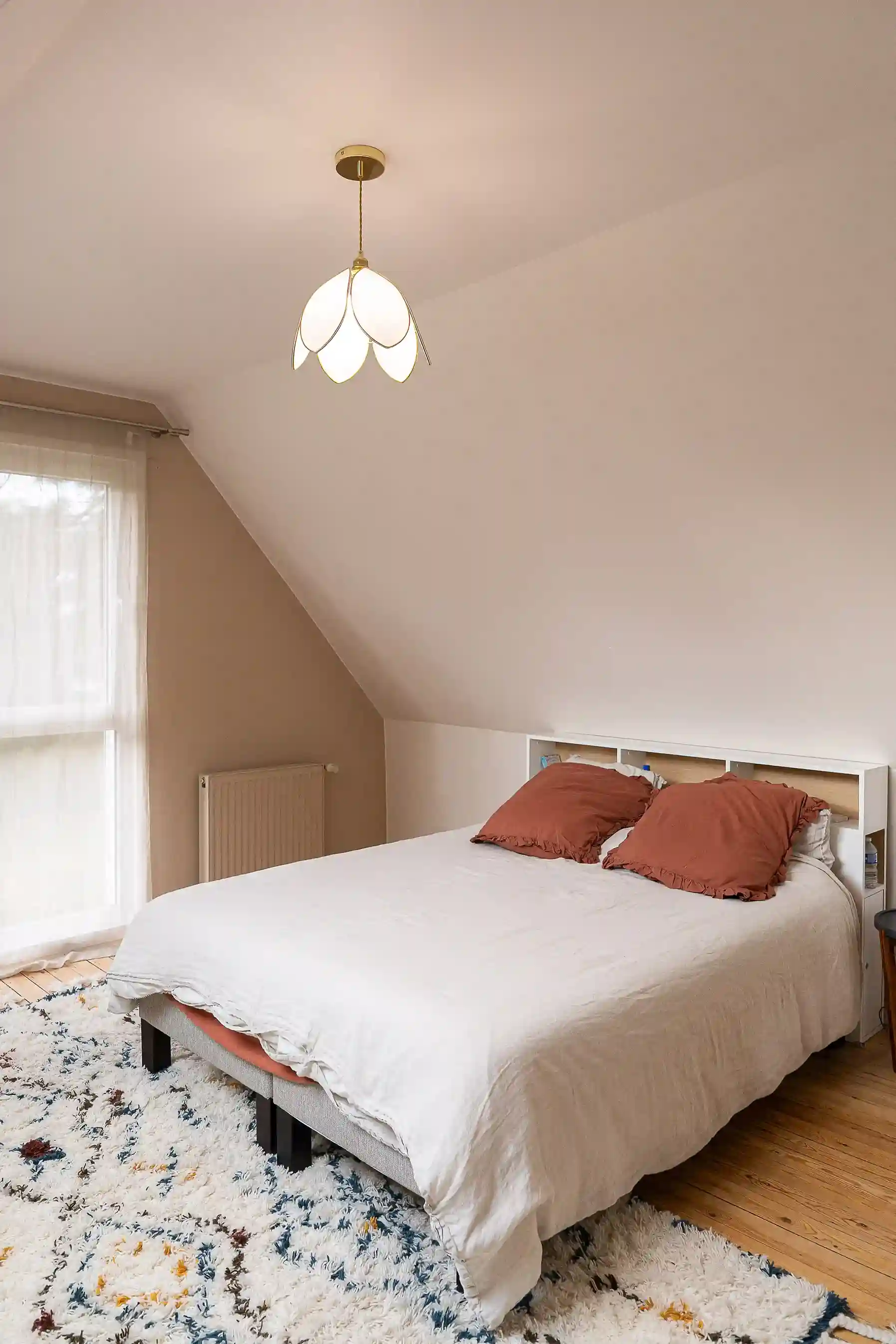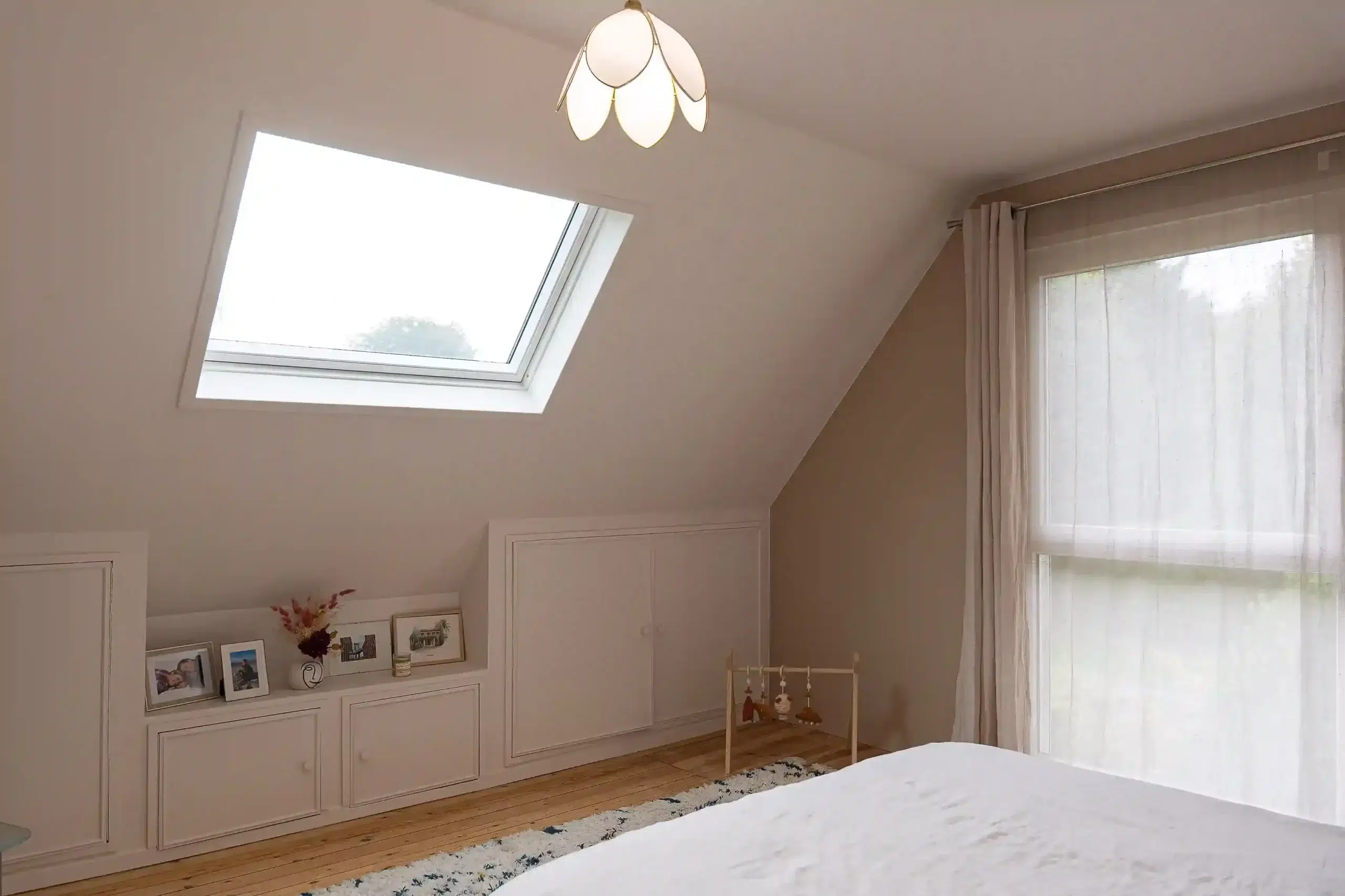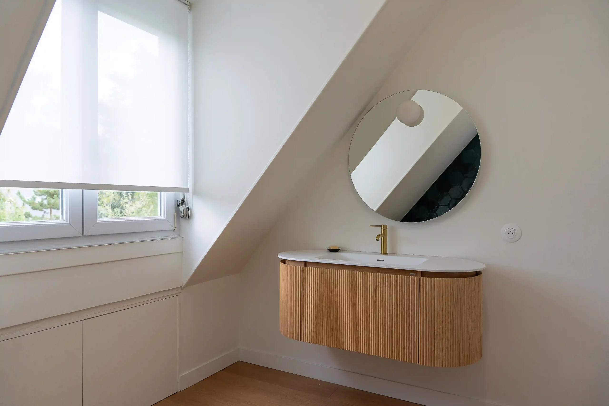 Implantée sous les combles et sur un demi niveau, la suite parentale constituait l’un des principaux enjeux du projet. Initialement froide et peu accueillante, elle a été entièrement repensée pour devenir un espace chaleureux et apaisant.
